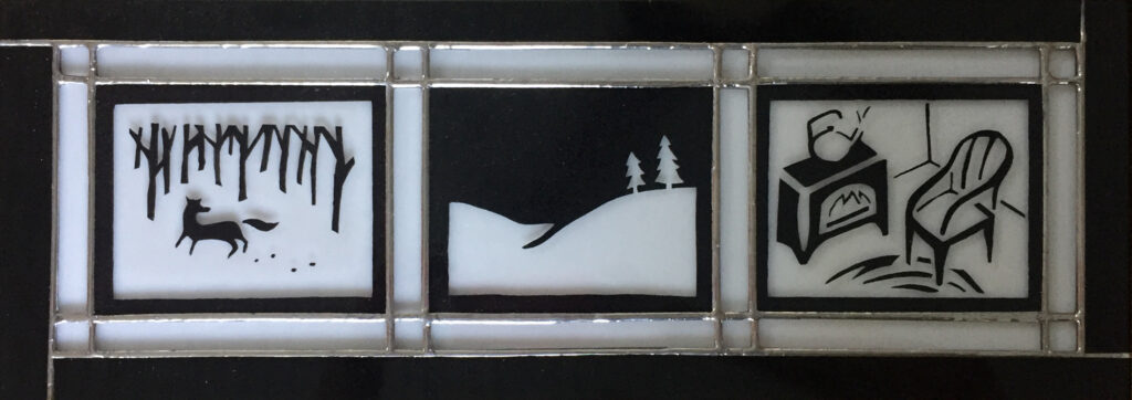For a number of years, my daughter created hand-cut Christmas cards. In the panel below, three of the card designs have been recreated via kiln-fused painted glass.