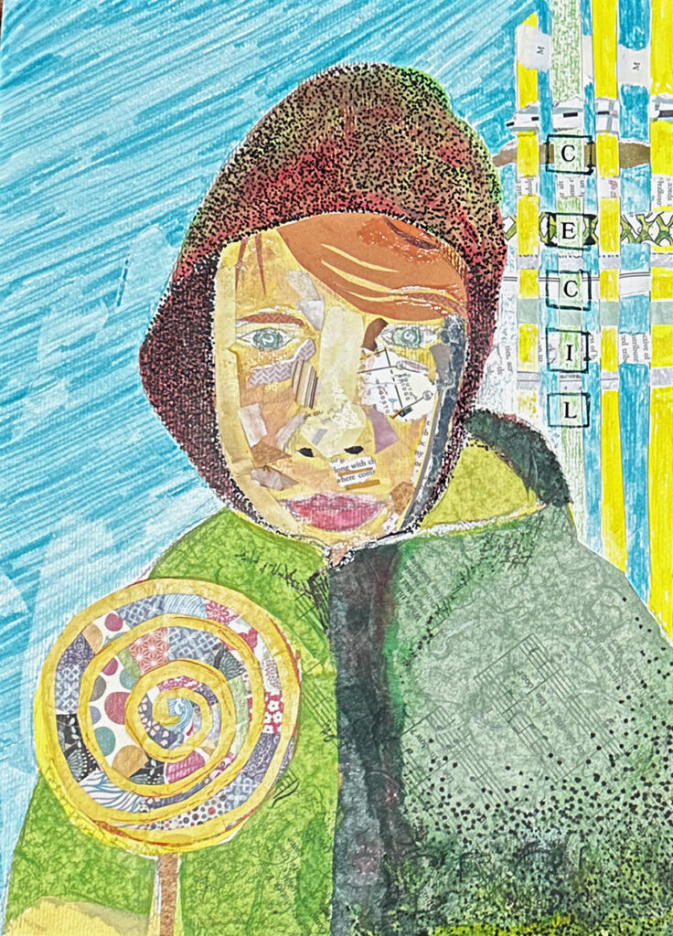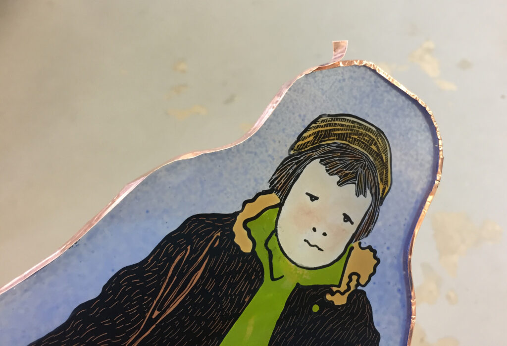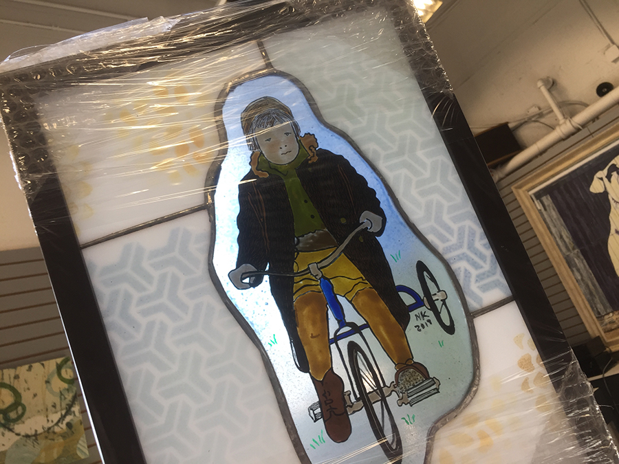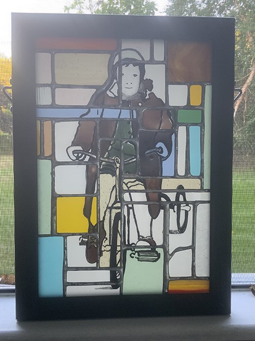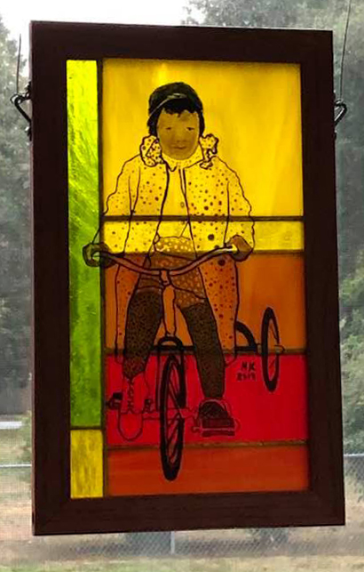 Working with family photos and ephemera is a mainstay of my artwork. Below is a series of stained glass pieces that came to life from a photograph of my mother riding a tricycle. These pieces were created in a 2019 workshop at Snow Farm.