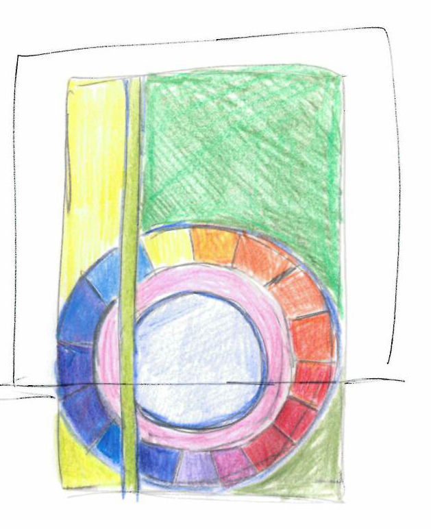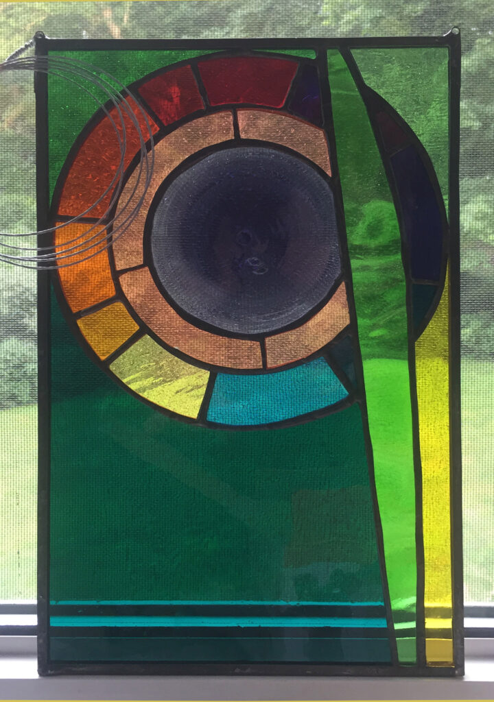 When my grandson was born in 2018 I hoped to create a stained glass panel for him that would be visually interesting to an infant while withstanding the inevitable “growing out of it” associated with typical baby or toddler-themed motifs. Below is a conceptual sketch done in preparation of the color wheel panel and a photo of the finished panel.