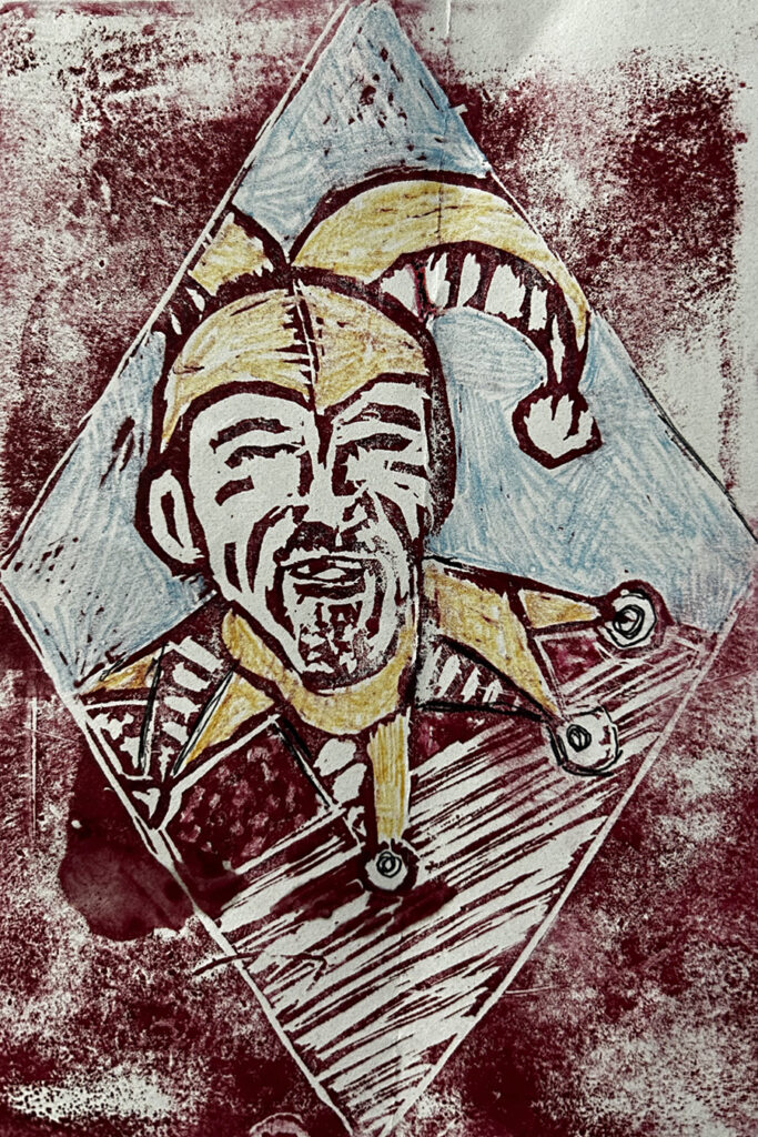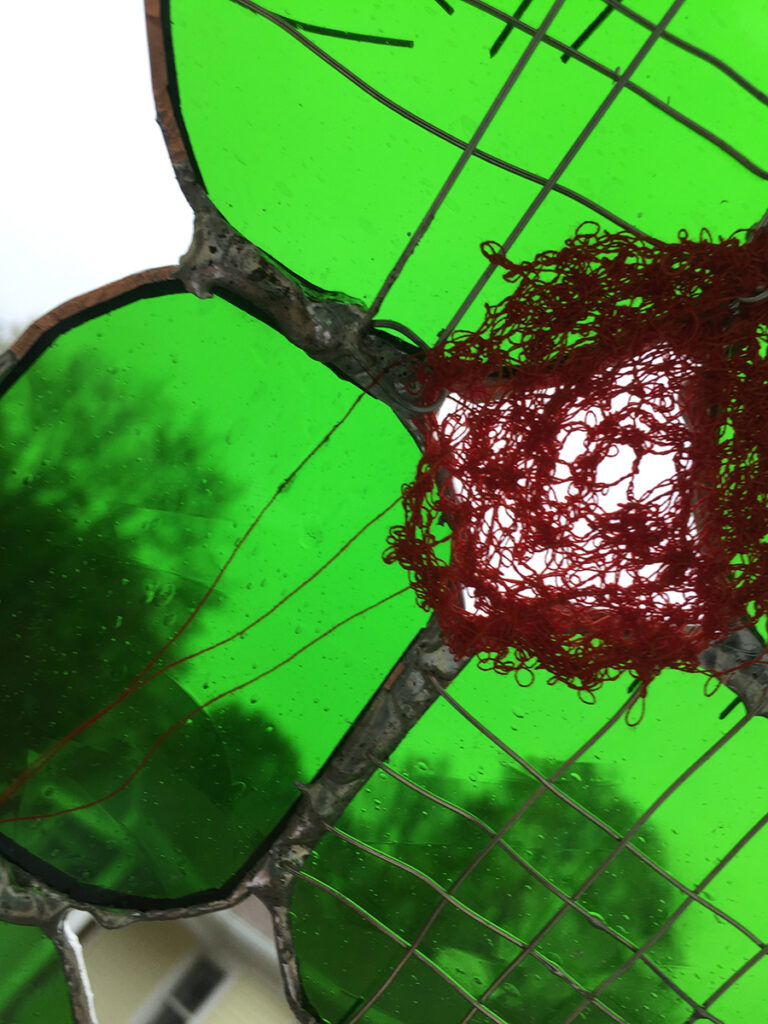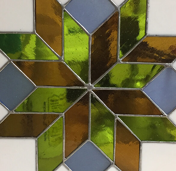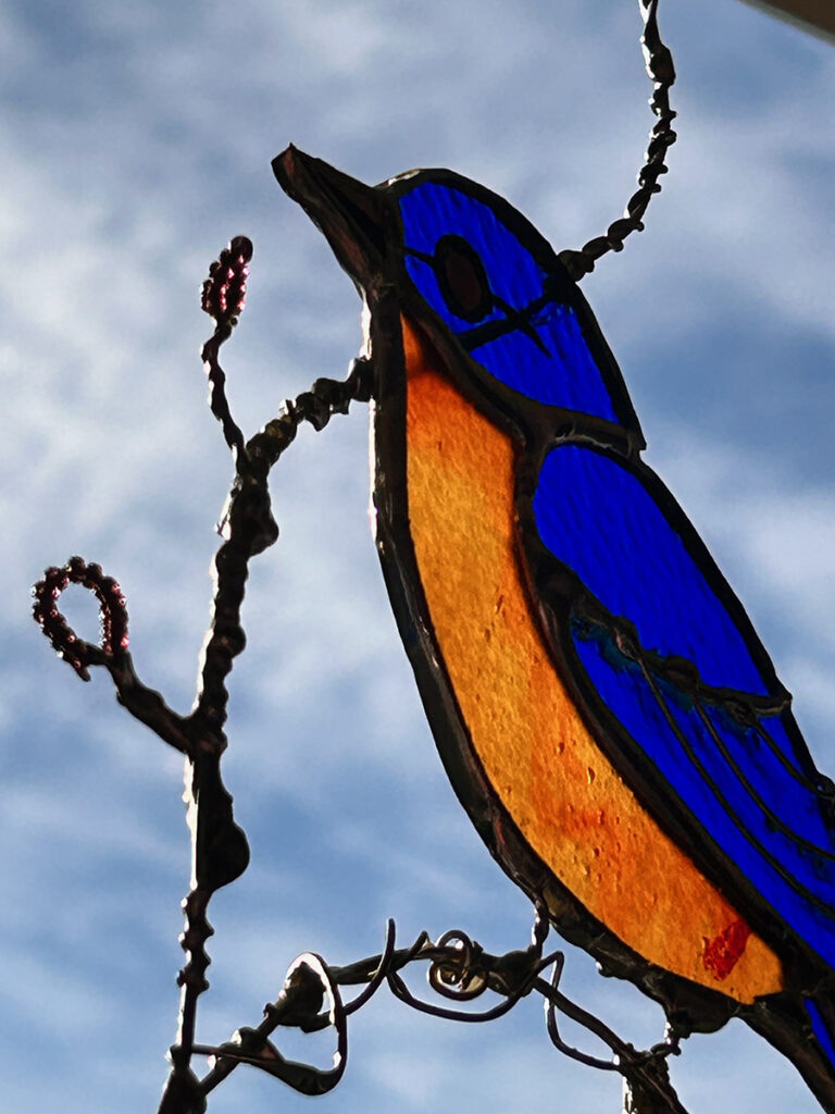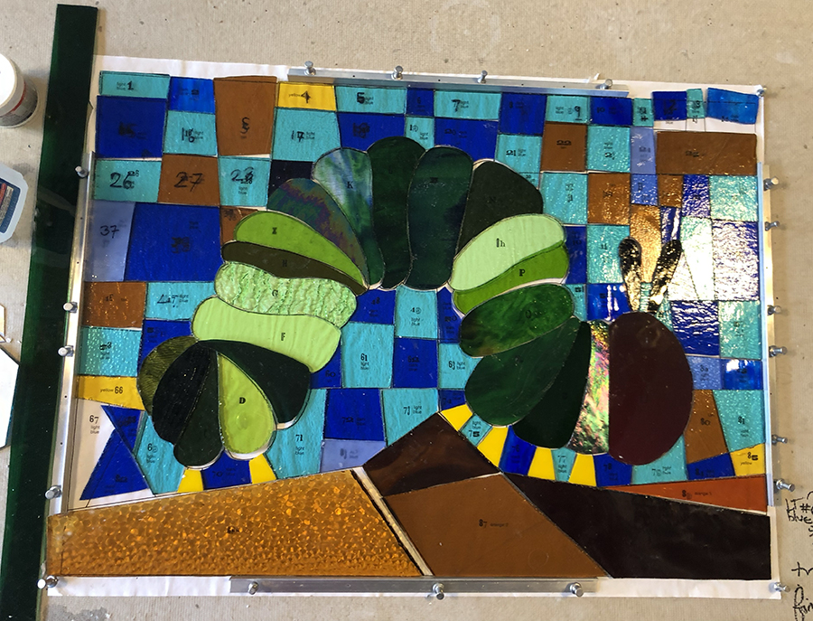 My journey working with stained glass began with a brief introduction nearly 40 years ago but quickly took a multi-decade hiatus while I focused on raising my children. I picked it up again about 10 years ago, producing some traditional sun catchers and panels. In 2019 I attended a workshop at Snow Farm taught by Joseph Cavalieri. I was excited to expand my stained glass processes to include painting (and fusing that paint) on glass. I continue to make use of this option whenever I am able. I have most recently, again when facilities are available, experimented with fused glass options. This interest was prompted by a 2024 workshop with glass artist Tim Carey which included image creation with kdsfksdkfjkdsf and frit as well as the creation and ultimate integration of custom sliders and frit lace.