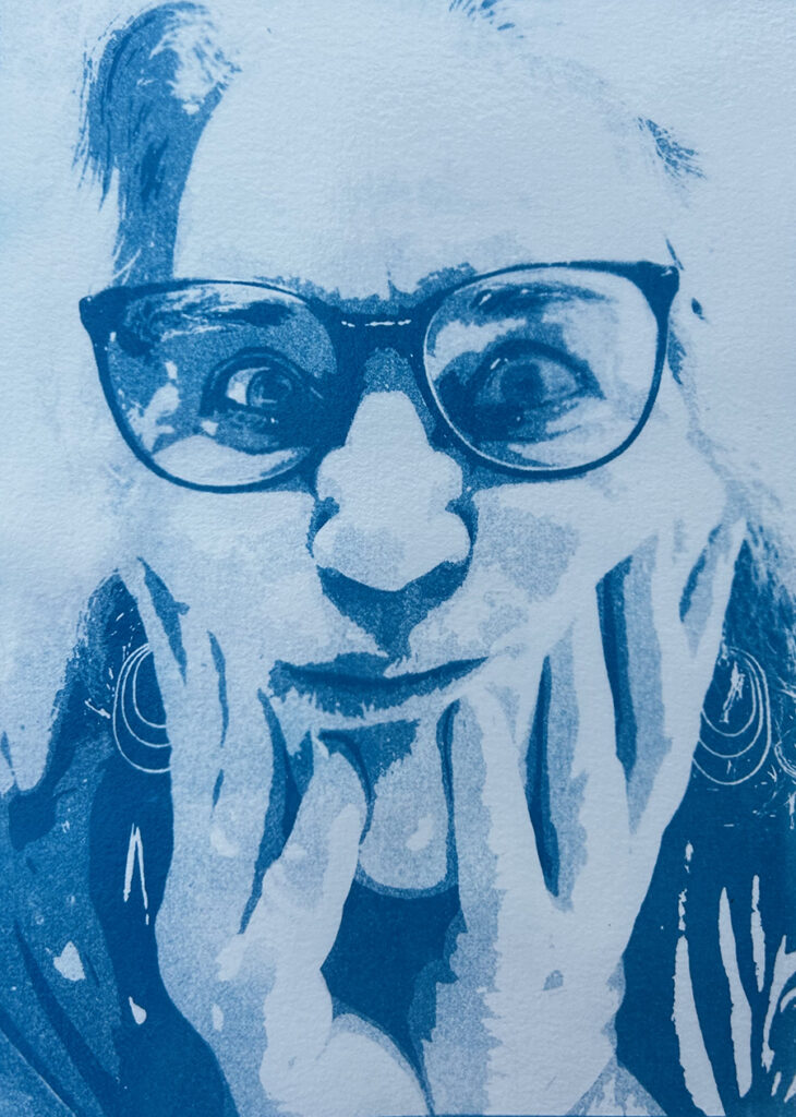 This has been the impetus of my idea to meld two favorite media: glass and cyanotype. I’d like to use the studio residency to explore portraits on glass that combine kiln-fired painted glass with cyanotype on glass. I have begun experimenting with digital negatives that I might use for this process. I have included one below (last image).