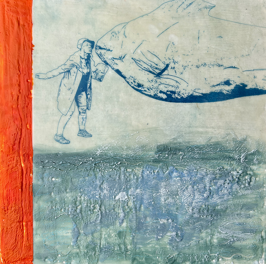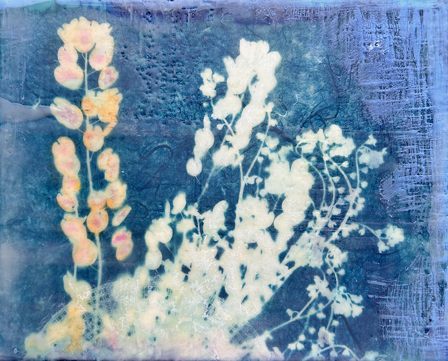 Within the past few years I have started working with encaustic paints and most recently with combining encaustic and cyanotypes. The two panels below were created from the same digital negative to produce cyanotypes which were then worked into encaustic panels.