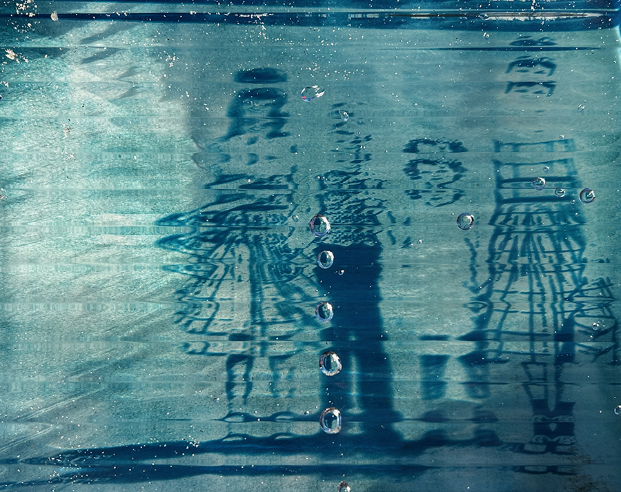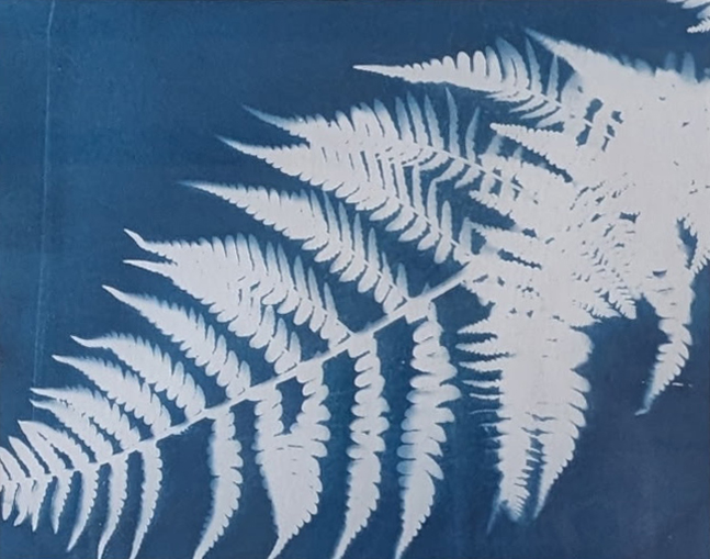 Cyanotype is a gorgeous art form with a long history. The process is not complicated which somehow adds its charm. The cyanotype on the left below is a very traditional representation of the medium. I include in any sample collection because I’m particularly excited with the circumstances under which it was created. Cyanotype production is rather portable. No darkroom is required and development is done with water only. This fern print is a test subject in my quest to print at least one cyanotype at the completion of a family hike. This print was exposed and developed in the parking lot of the Main Street trailhead for Canonchet Preserves in Hopkinton, RI. Once suitable hiking and cyanotyping weather returns I will be dusting off my portable development materials and starting with my “take a hike, make a print you like” project. The image on the right is a digital photograph of a cyanotype in development. This particular development session took place at Narragansett Town Beach late in the summer of 2025. Here I was experimenting with using salt (sea) water versus tap water. I was struck by the defraction caused by the surface texture of the developing tank as well as the appearance of air bubbles as I agitated the developing tank.