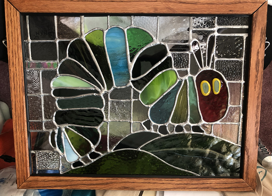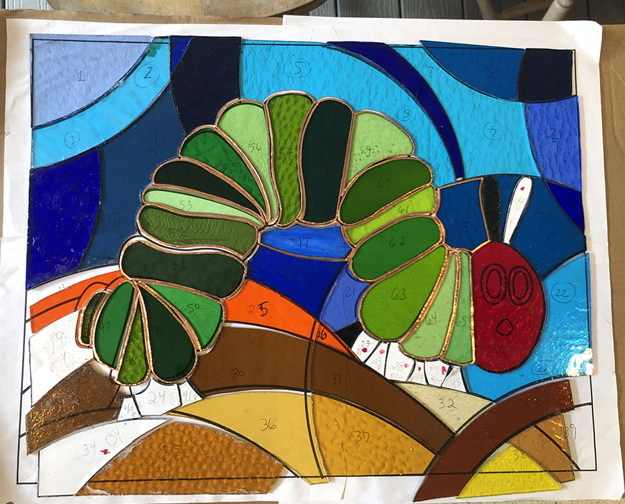 An ongoing series of caterpillar stained glass panels have been completed and others are underway for a number of young family members. The caterpillar is loosely based on Eric Carl’s “Very Hungry Caterpillar”. I enjoy the process of investigating various solutions to one theme, hence the variation in background arrangement